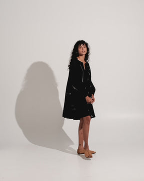 This vintage-inspired relaxed short dress has gentle gathers at the front and back, relaxed long sleeves with gatherings, and a knee-length. The finely woven cotton fabric is hand-detailed with abstract motifs by the weavers of East India. You can style it with minimal jewels and a pair of flats or gladiators to elevate your look.